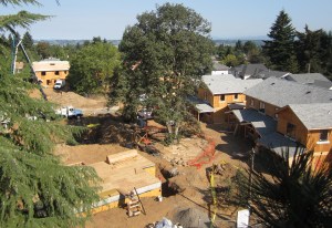 I scurried up a neighbor’s tree for this overhead photo. The last multi-unit building had trusses delivered today, so soon all the 3-BR homes will be roofed. Unit 14 is decked and the footing for Unit 15 was poured this morning, so the single family homes are coming in close behind. Electricians are rolling through Units 9-13 while plumbers and HVAC folks work on Units 1-8. Next subs to add to the mix: insulation, drywall, gutters and siders. Keep sunny/dry weather in the forecast. We love it!
