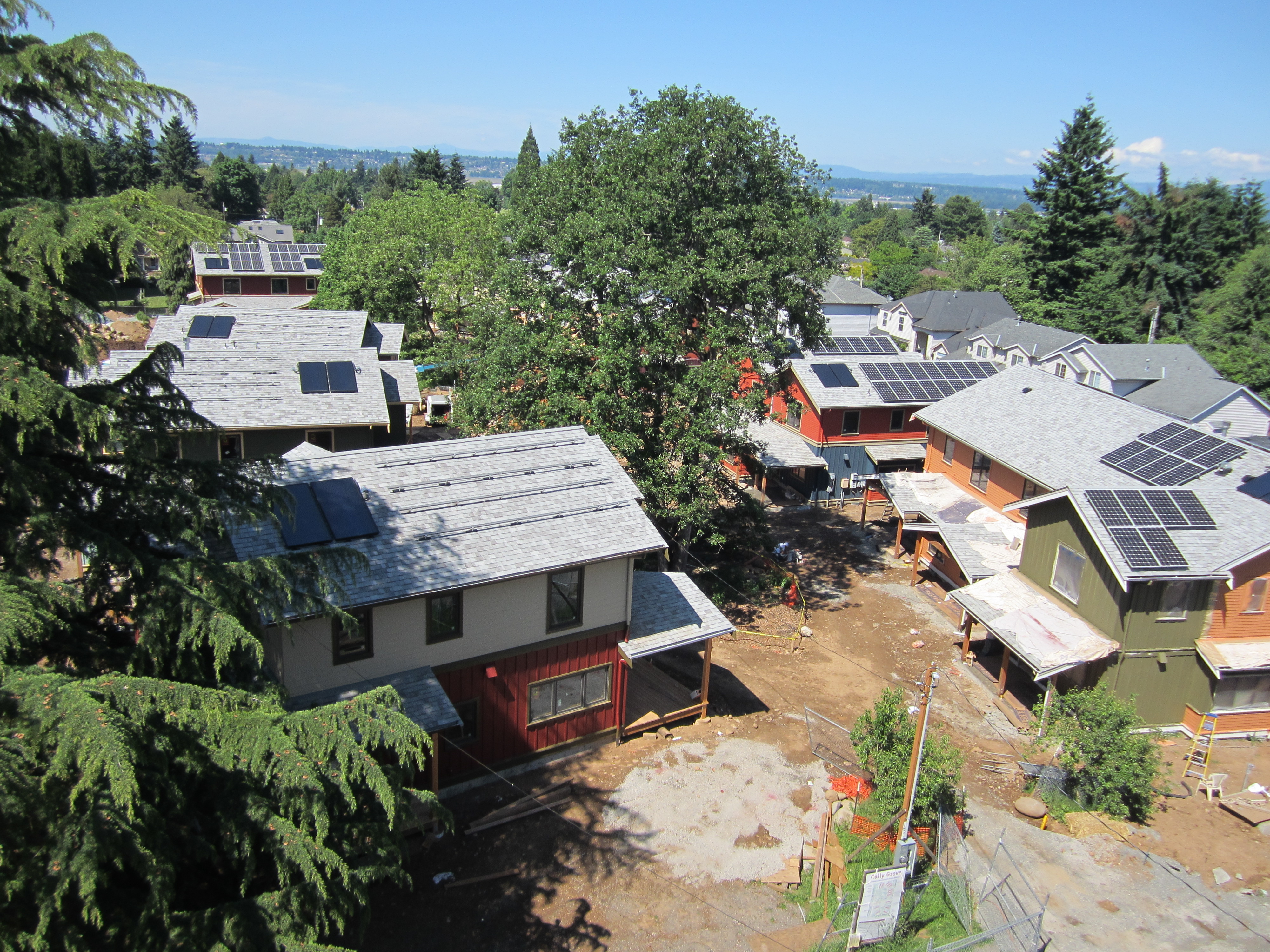 It was so beautiful yesterday I couldn’t resist climbing our neighbor’s tree to take this aerial shot of Cully Grove. Utility trenches are all closed up (finally!) and we’ve been taking advantage of the lovely weather to pour front porch pads, build rear decks, go crazy painting building exteriors, and work on final site grading. Meanwhile, interior subcontractors (tile, flooring, cabinets, electricians, plumbers…) continue rolling through the units. Solar panels are up on all homes but the single family units – and those will be installed in the coming week. Looking ahead, we’re scheduling out half street improvements along Going St. and curbs/paving of our driveway and parking spaces. More soon! – Eli