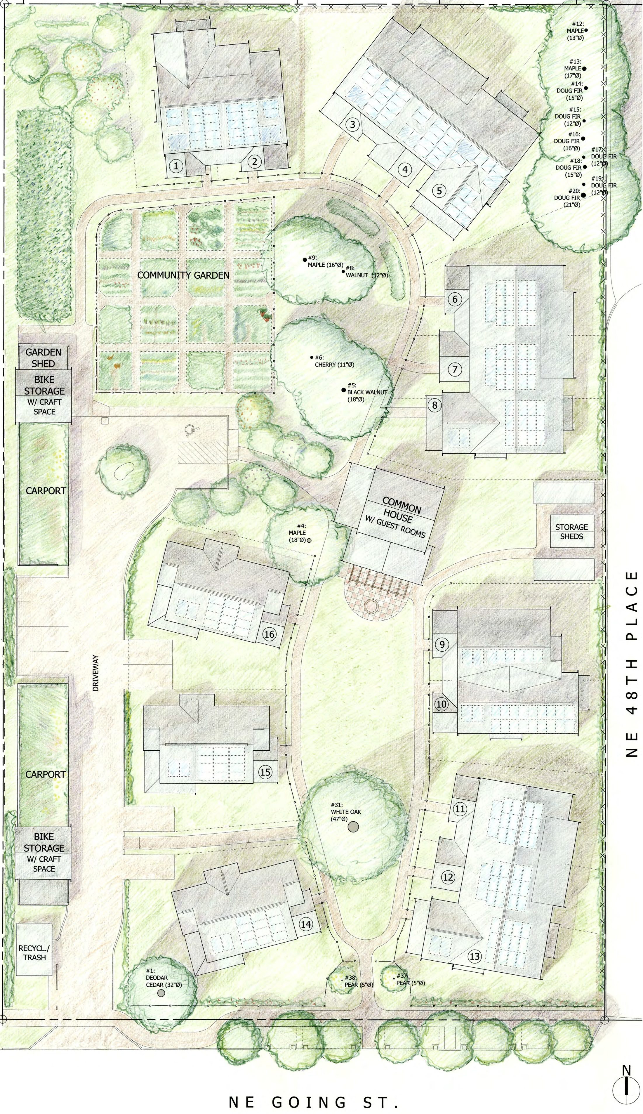 The 1.84 acre site has been laid out so the community has a welcoming presence on NE Going Street. The common building and garden are centrally located at natural crossing points in the pedestrian circulation pattern, while vehicular parking is located on the periphery of the site. Homes are clustered onto relatively small lots so substantial portions of the site can remain as open space. Existing mature trees are preserved where possible.