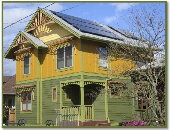 Peninsula Park Commons is a community on the west side of Peninsula Park in N. Portland. It contains 3 1-BR homes, 4 2-BR homes, 2 3-BR homes, common unit, guest house, shared bike room, and 2 shared courtyards.